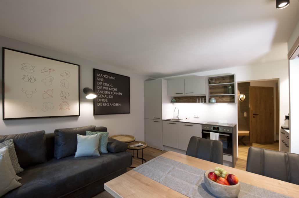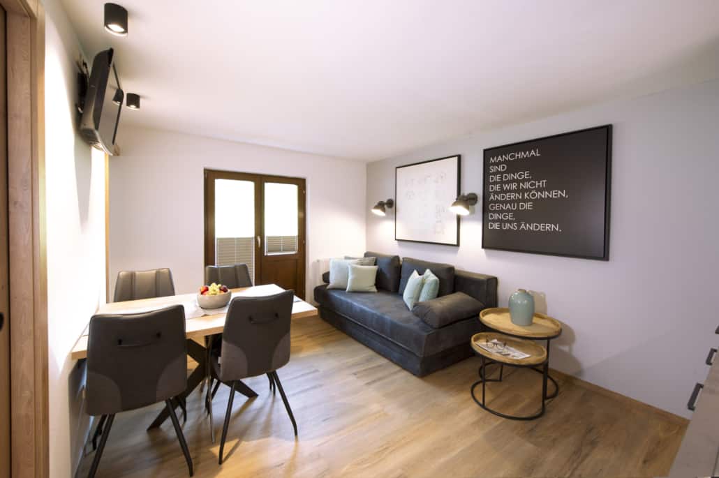 Wohnküche mit Couch, Essecke, Balkon, TV, USB-Anschluss und freies W-Lan